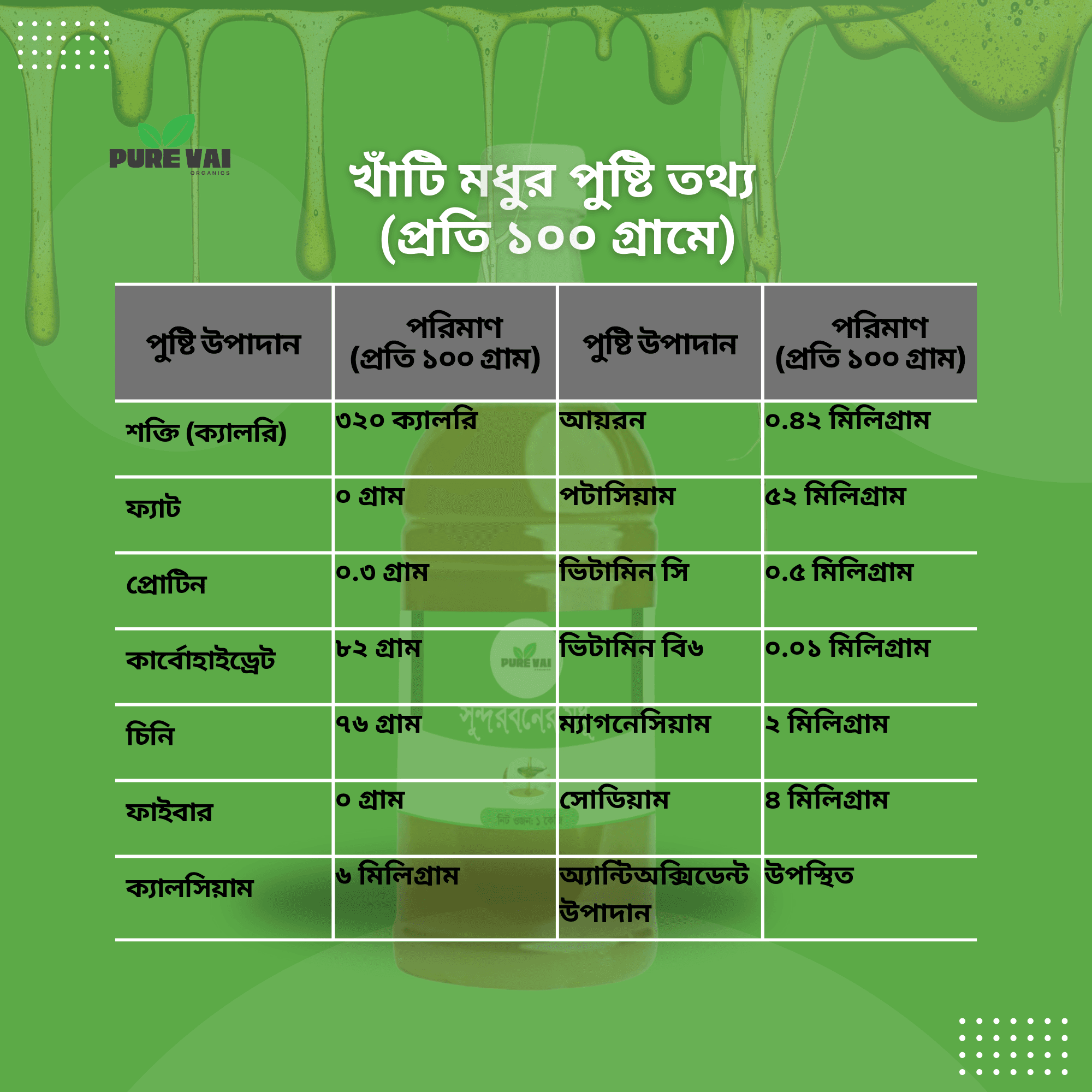 | উপাদান | সম্পূর্ণ খাঁটি ও অর্গানিক সুন্দরবনের মধু |